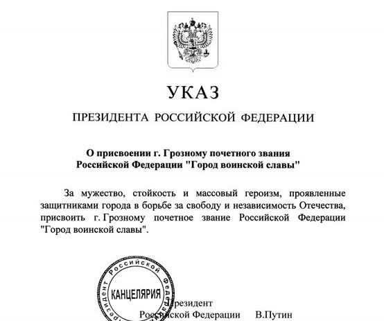 29.05.2015Почётное звание Российской Федерации «Город воинской славы» присвоено Грозному за мужество, стойкость и массовый героизм, проявленные защитниками города в борьбе за свободу и независимость Отечества. «Город воинской славы» – почётное звание Российской Федерации, установлено Федеральным законом 9 мая 2006 года. Звание присваивается городам Российской Федерации, на территории которых или в непосредственной близости от которых в ходе ожесточённых сражений защитники Отечества проявили мужество, стойкость и массовый героизм, в том числе городам Российской Федерации, которым присвоено звание «Город-Герой». В городе, удостоенном звания «Город воинской славы», устанавливается стела с изображением герба города и текстом Указа Президента Российской Федерации о присвоении городу этого звания, а также проводятся публичные мероприятия и праздничные салюты 23 февраля (День защитника Отечества), 9 мая (День Победы) и в День города